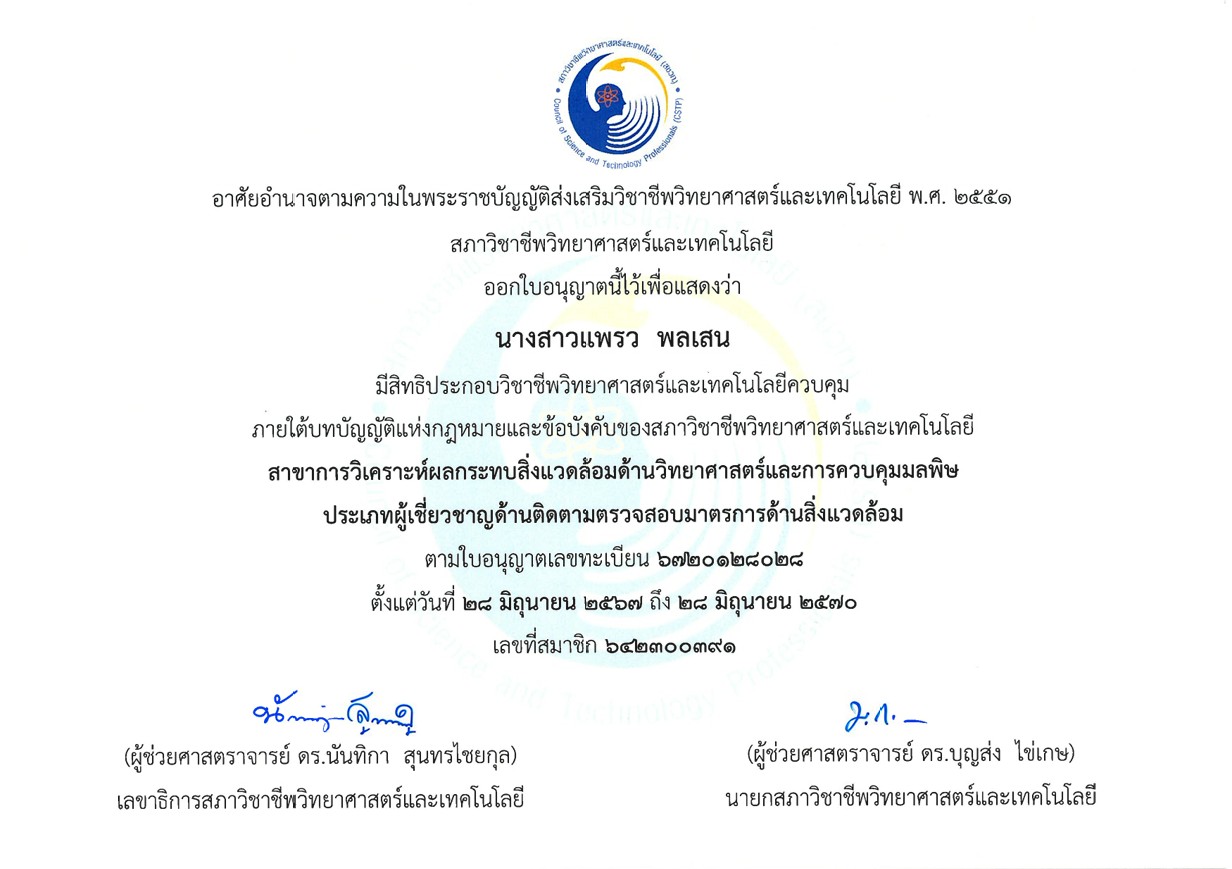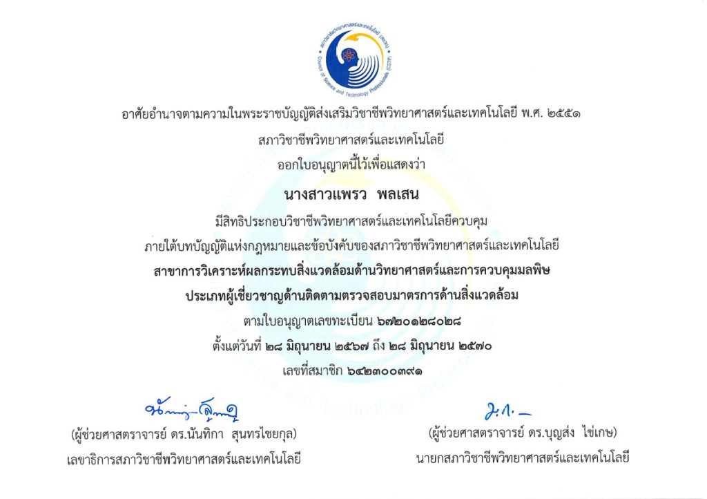 ได้รับการขึ้นทะเบียนประกอบวิชาชีพ วิทยาศาสตร์และเทคโนโลยี พ.ศ. 2551 สาขาการวิเคราะห์ผลกระทบสิ่งแวดล้อมด้านวิทยาศาสตร์และการควบคุมมลพิษ ประเภท ผู้เชี่ยวชาญด้านติดตามตรวจสอบมาตรการด้านสิ่งแวดล้อม จาก สภาวิชาชีพวิทยาศาสตร์และเทคโนโลยี